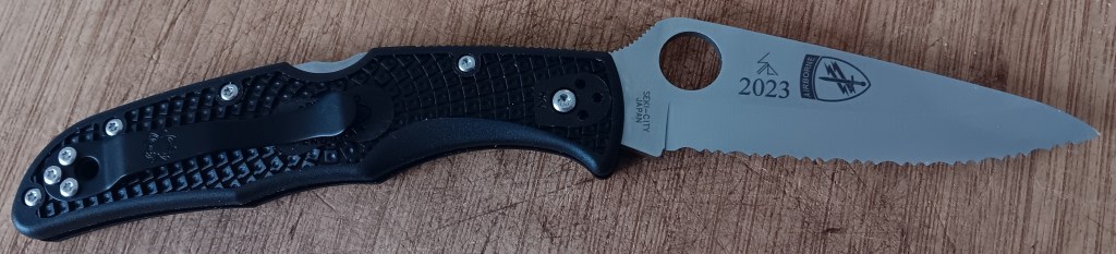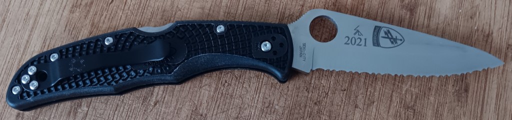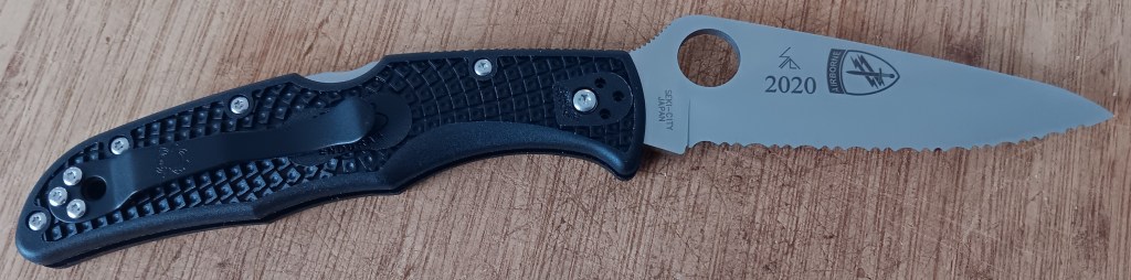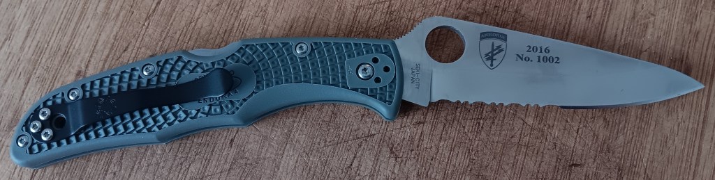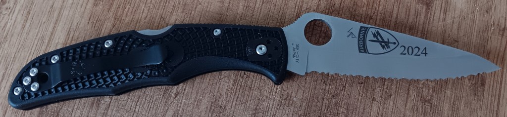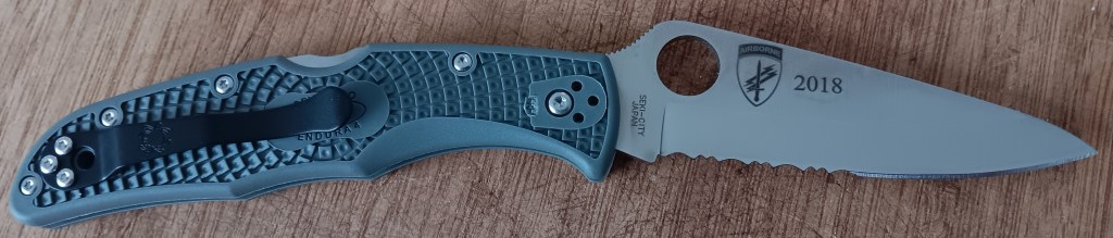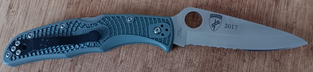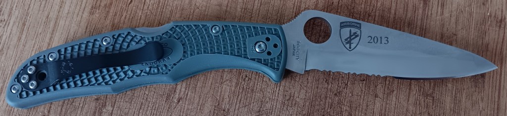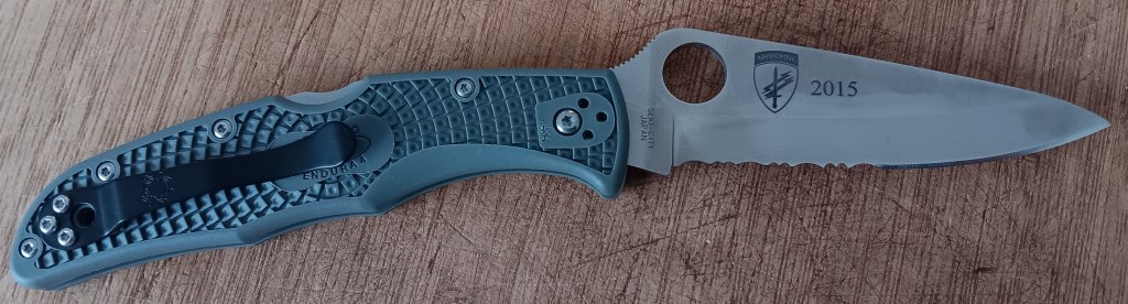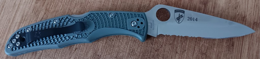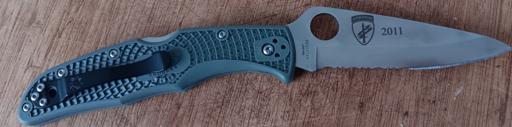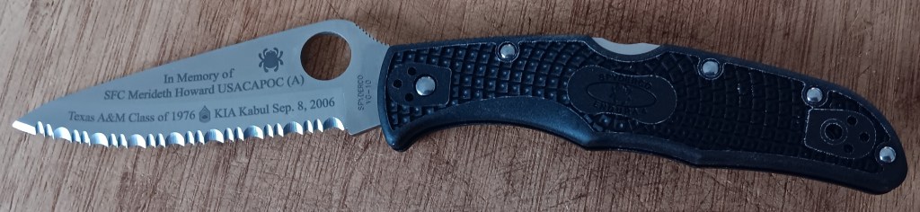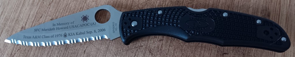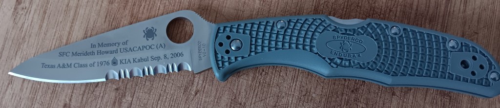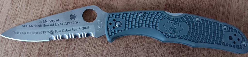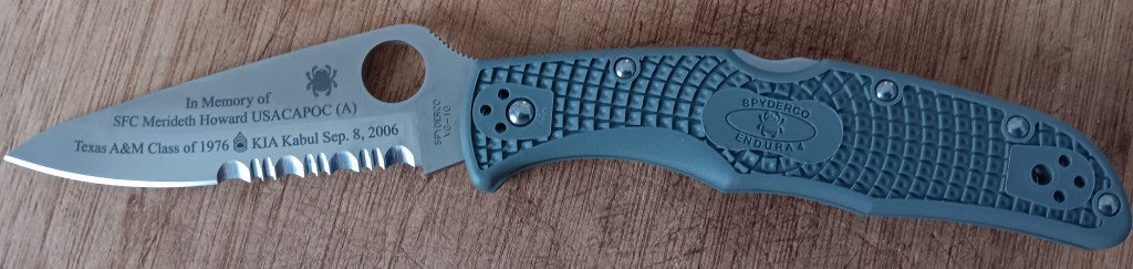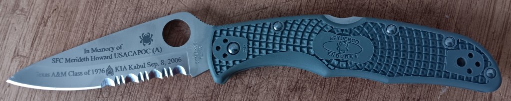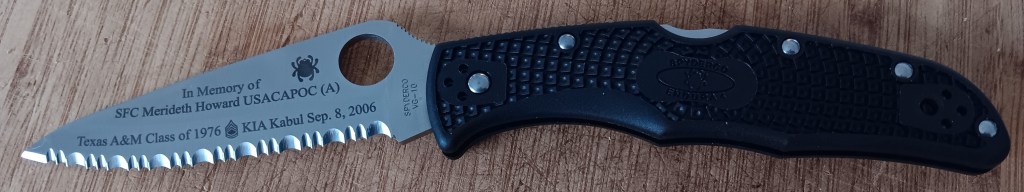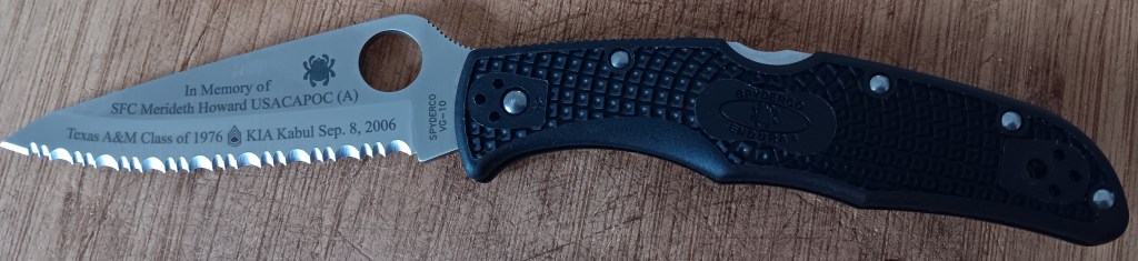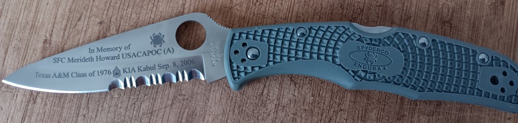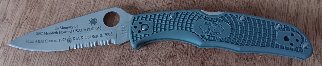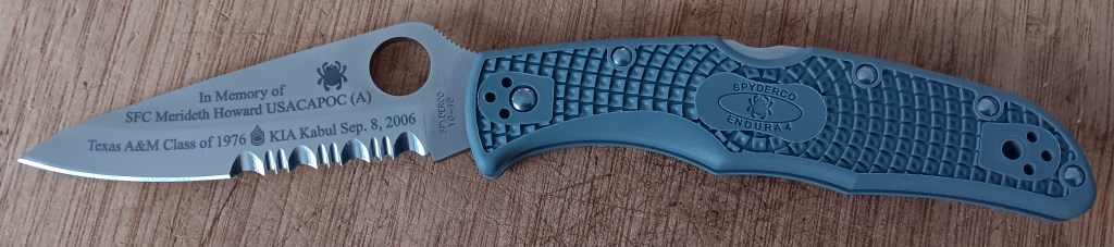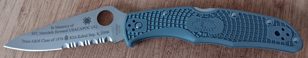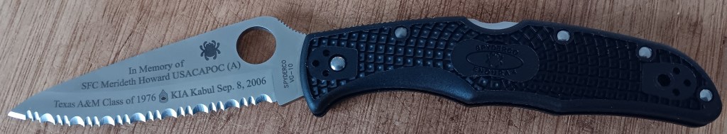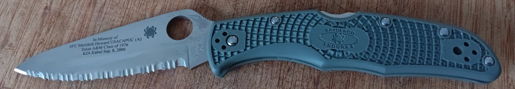 Merideth told me the most useful thing she took with her to Afghanistan was the Spyderco folding pocket (Military Model) knife I sent with her. After some research I found that Spyderco has its own laser engraving department and does a very good job at reasonable prices. I picked the Endura 4 with the SpyderEdge serrated edge and fiberglass-reinforced-nylon handle. Over the years the blade serrations have varied from full and half blade length depending on availability. The serrated edge is purely a personal preference. I have carried a knife most of my life and found a good, serrated edge is sharp more often than a plane edge.